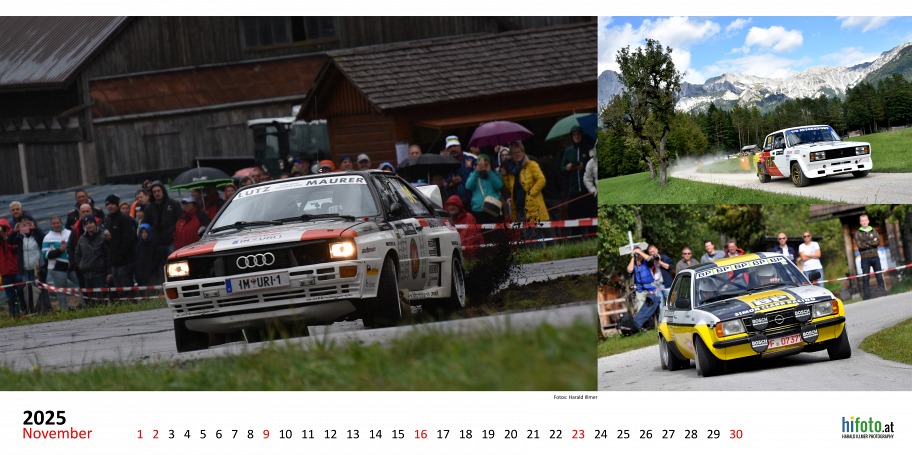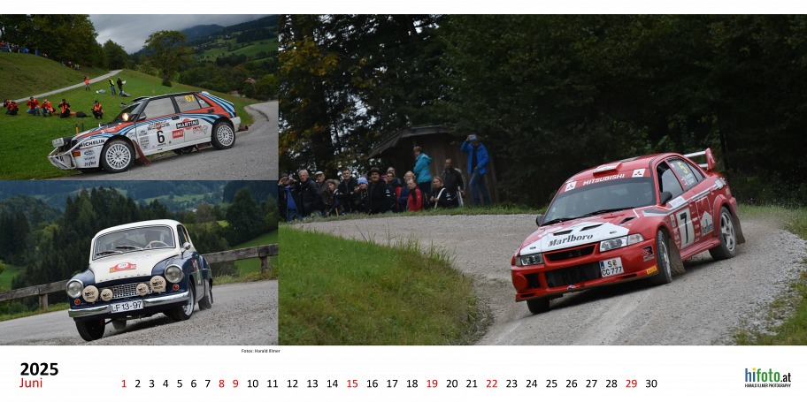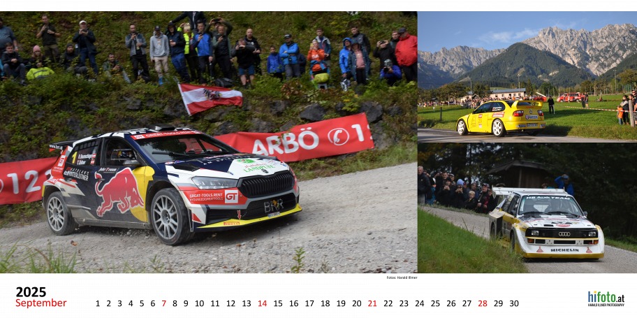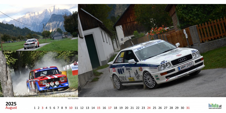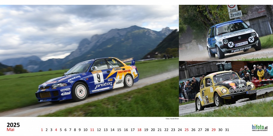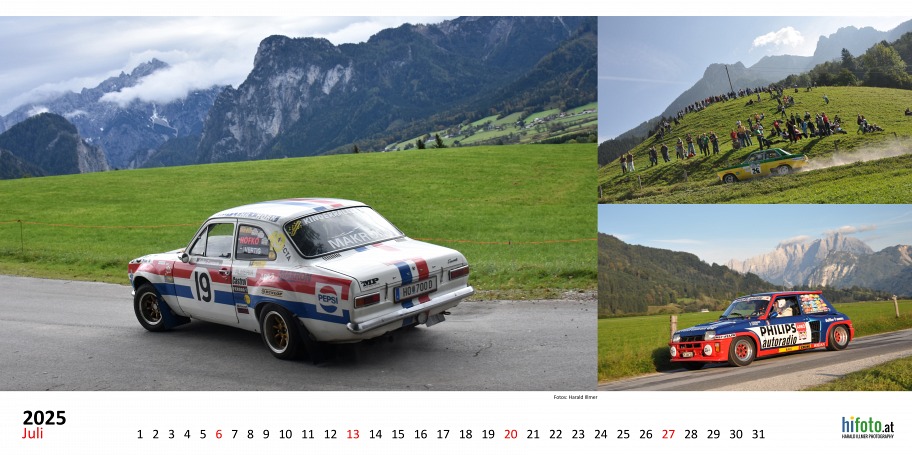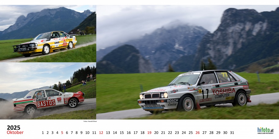 Der offizielle Austrian Rallye Legends Kalender 2025 zeigt legendäre Rallyeboliden in malerischer Landschaft